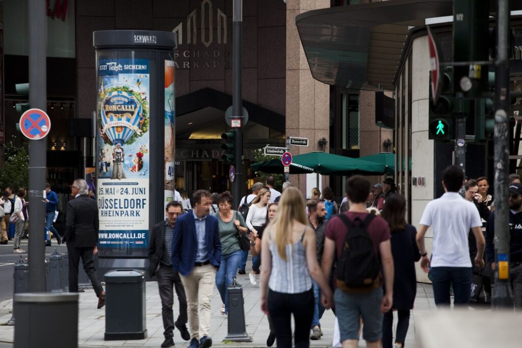Rotierend, hinterleuchtet und rund um die Uhr präsent. Exklusive Innenstadt-Standorte in Düsseldorf für Marken, die Aufmerksamkeit und ein hochwertiges Image wünschen.